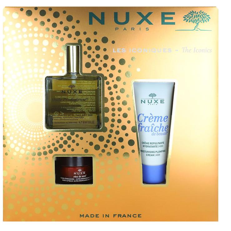 Craquez pour un moment de sensorialité hors du temps grâce aux soins corps du coffret Nuxe. Ce coffret Les Iconiques contient une crème, une huile et un baume à lèvres.