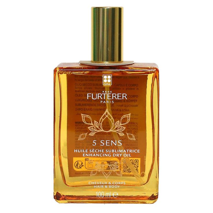 5 sens huile sèche sublime René Furterer, non grasse et discrètement parfumée, hydrate et sublime la peau, nourrit et protège les cheveux qu'elle rend souples, soyeux et brillants