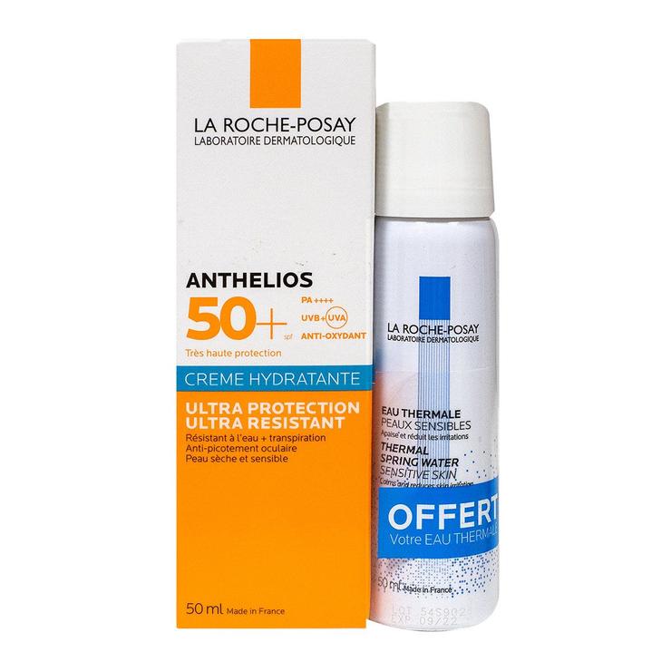 La crème solaire Anthélios SPF50+ La Roche-Posay est un soin solaire hydratant spécialement conçu pour les peaux sèches et déshydratées présentant un risque élevé face aux UV. Elle est formulée à base d'eau thermale de La Roche-Posay et à base de niacinamide et de panthénol et assure une très haute protection contre les UVA et UVB, elle prévient les dommages cellulaires liés aux UV et au vieillissement cutané, elle renforce la barrière cutanée protectrice et a également une action hydratante et apaisante. L'eau thermale La Roche-Posay est spécialement conçue pour les peaux sensibles, elle a une action apaisante, purifiante, rafraîchissante et adoucissante.