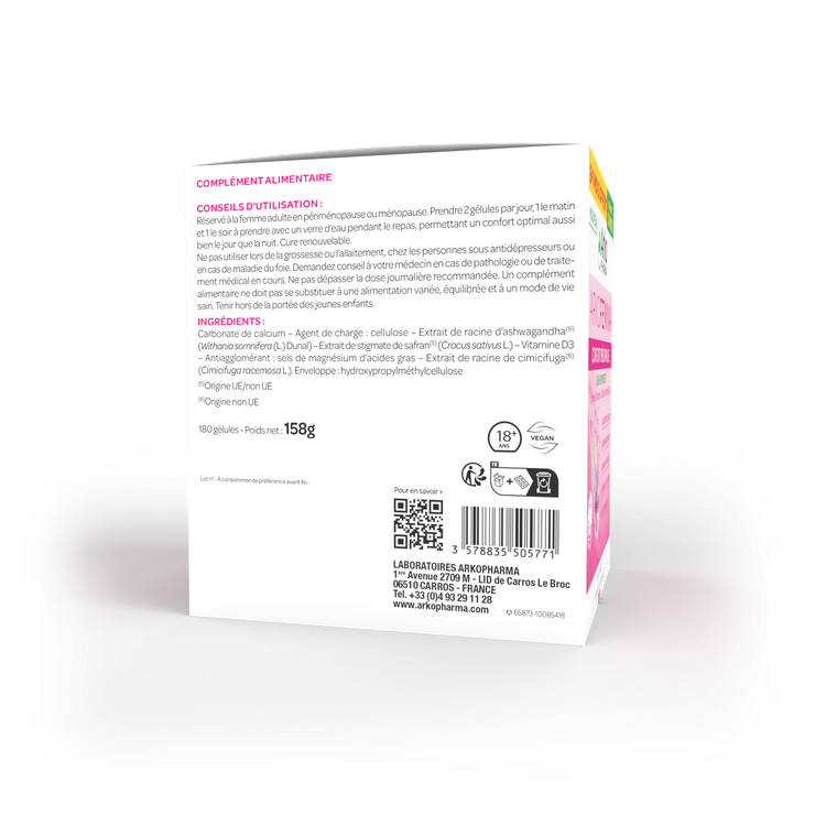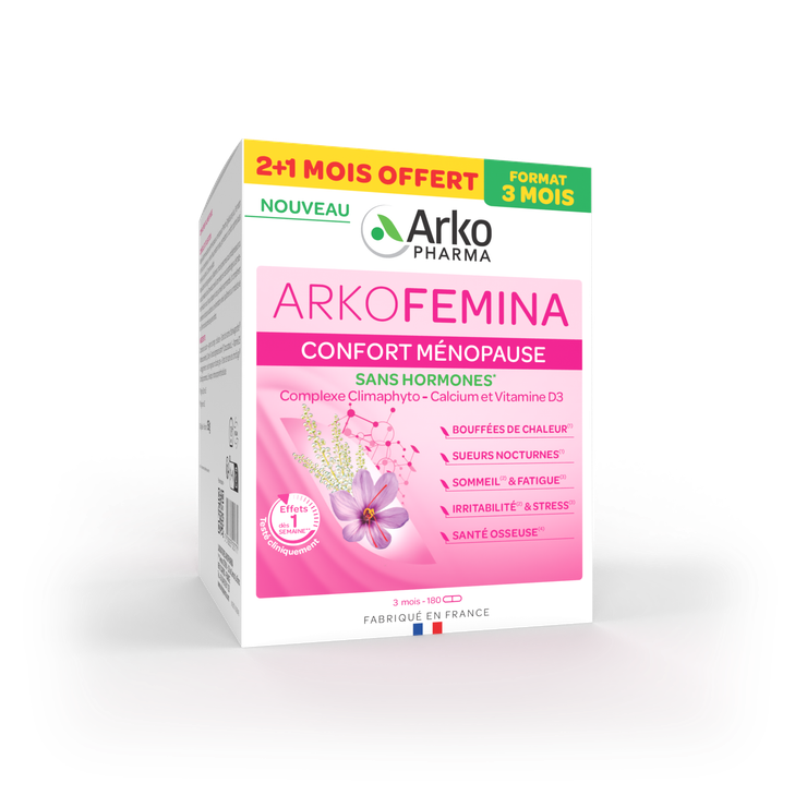 Les gélules Arkofemina confort ménopause Arkopharma constituent un complément alimentaire sans hormone spécialement conçu pour les femmes en période de ménopause ou périménopause pour lutter contre les symptômes associés tels que bouffées de chaleur, troubles de l'humeur et sueurs nocturnes. Elles sont formulées à base de luzerne qui atténue les bouffées de chaleur et les sueurs nocturnes, de sauge qui soutient l'équilibre hormonal et régule la transpiration, de houblon aux vertus apaisantes qui calme l'irritabilité et favorise un sommeil de qualité et à base d'Ashwagandha qui booste l'énergie et améliore la résistance au stress. Elles contiennent également de la vitamine D3 et du calcium qui participent au maintien d'une ossature normale.