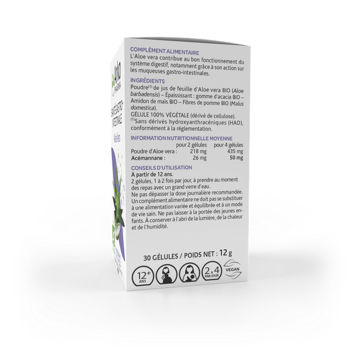 ** issu de l'agriculture biologique. Information nutritionnelle pour 4 gélules : Poudre d’aloe vera : 435 mg. Acémannane : 50 mg.