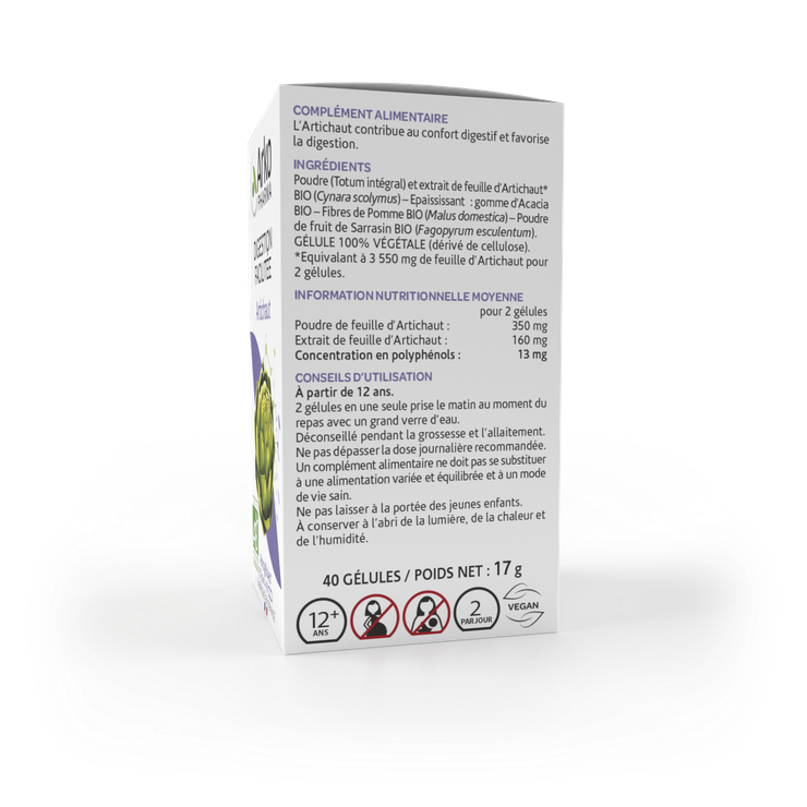 Le complément alimentaire Arkogélules Artichaut bio est recommandé pour le confort digestif. Il est composé d'artichaut avec 13 mg de polyphénols. Il permet d'améliorer la digestion et aide au confort digestif. Il se présente sous forme de gélules.