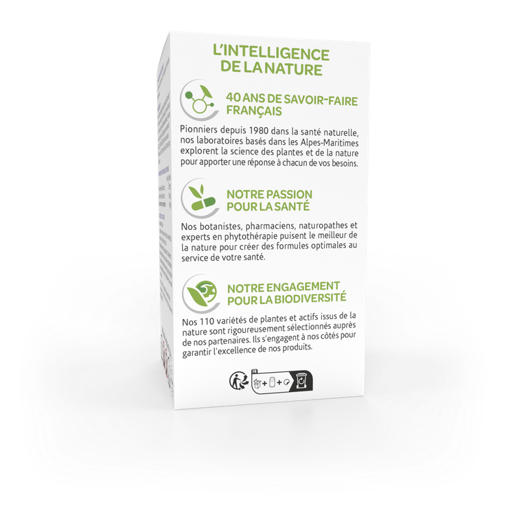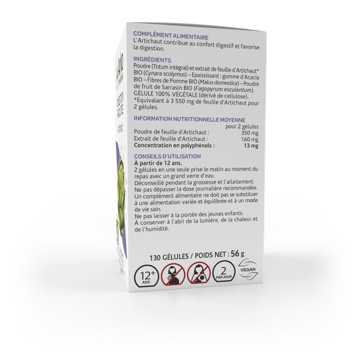 Poudre (Totum intégral) et extrait de feuille d’Artichaut* BIO (Cynara scolymus) – Epaississant : gomme d’ Acacia BIO – Fibres de Pomme BIO (Malus domestica) – Poudre de fruit de Sarrasin BIO (Fagopyrum esculentum). Gélule 100% végétale (dérivé de cellulose).