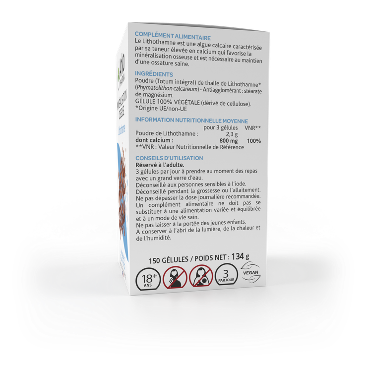 Poudre de Lithothame (Lithothamnium calcareum) : 769 mg/gélule (soit 87 %) titrée au minimum à 60 % de carbonate de calcium - Antiagglomérant : stéarate de magnésium.
