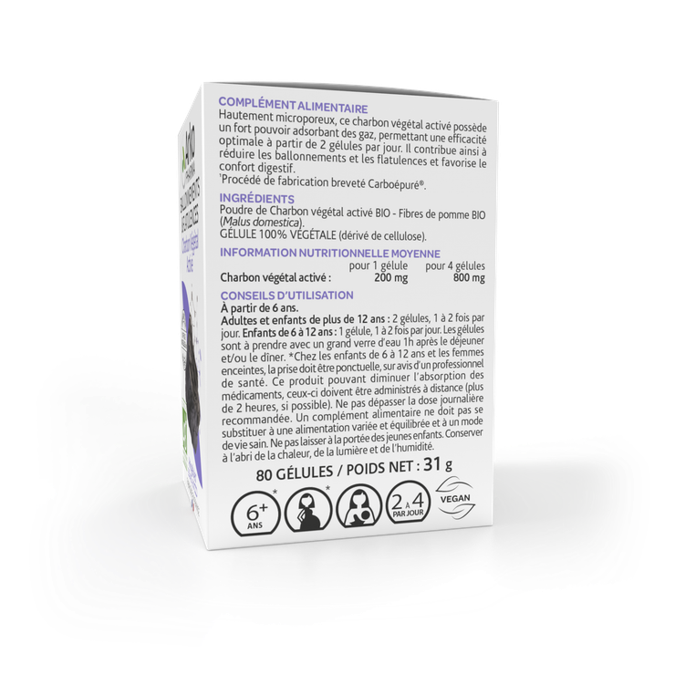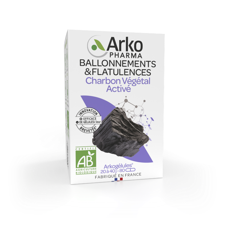 Les Arkogélules charbon végétal bio constituent un complément alimentaire qui possède une structure hautement microporeuse lui permettant de piéger les gaz digestifs. Il favorise ainsi le confort digestif et contribue à réduire les ballonnements.