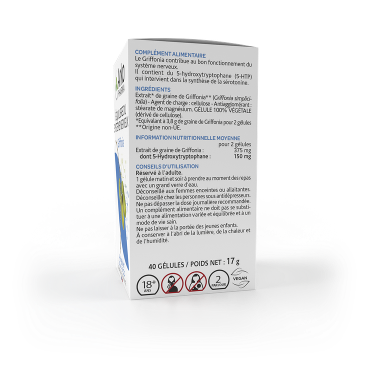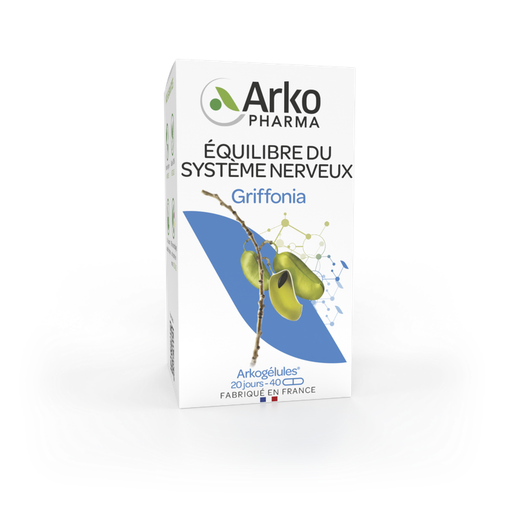 Les gélules Arkogélules griffonia 150mg 5-HTP Arkopharma constituent un complément alimentaire recommandé pour un bon fonctionnement du système nerveux grâce à l'action du griffonia qui favorise la production de sérotonine au sein de l'organisme, hormone du bonheur qui participe à notre bien-être.