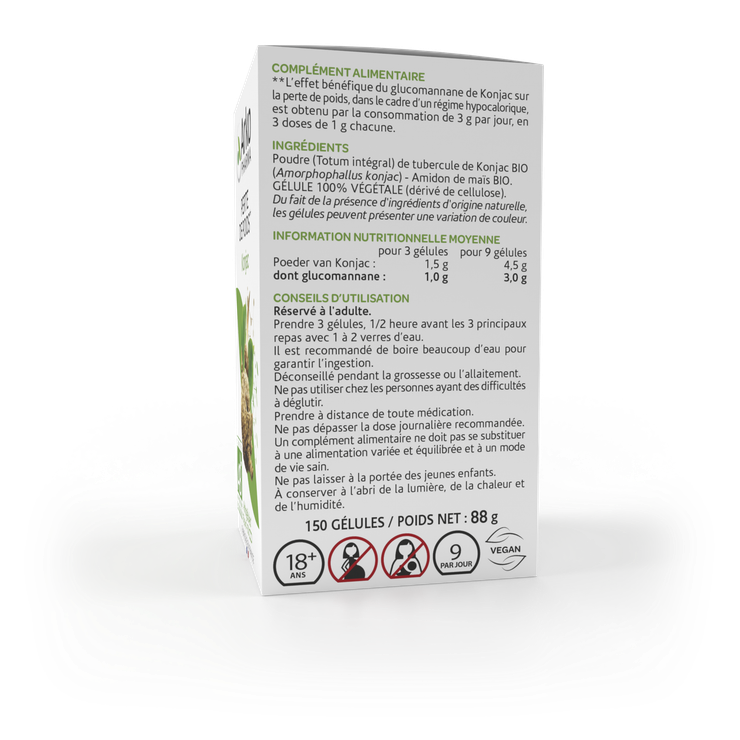 Poudre (Totum intégral) de tubercule de Konjac Bio (Amorphophallus konjac), amidon de Maïs Bio. Gélule 100% végétale (dérivé de cellulose).