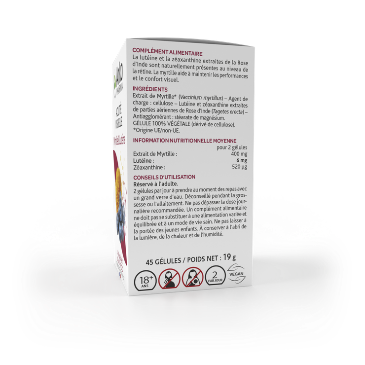 Extrait de Myrtille (Vaccinium myrtillus) - Agent de charge : cellulose - Lutéine et zéaxanthine extraites de parties aériennes de rose d'Inde (Tagetes erecta) - Antiagglomérant : stéarate de magnésium.