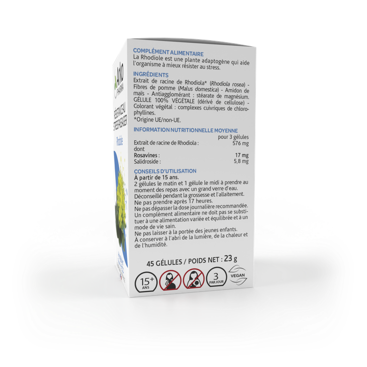 Extrait sec de racine de Rhodiola (Rhodiola rosea) 192 mg / gélule - Agent de charge : phosphate de calcium - Agent de charge : cellulose - Antiagglomérants : dioxyde de silicium - stéarate de magnésium.