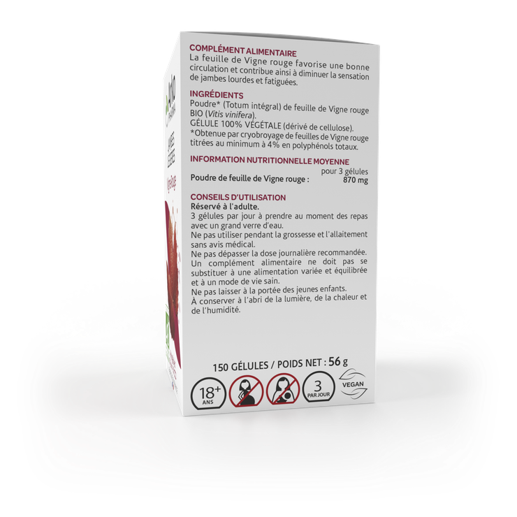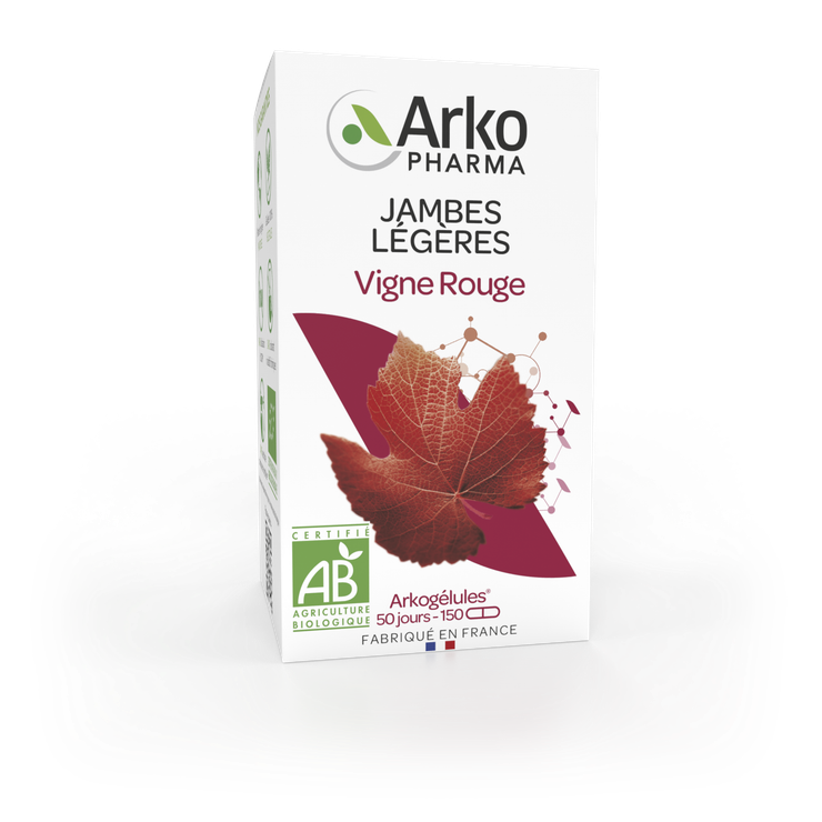 Les Arkogélules vigne rouge bio Arkopharma constituent un complément alimentaire à base de vigne rouge recommandé pour lutter contre les sensations de jambes lourdes et fatiguées et activer la circulation sanguine.