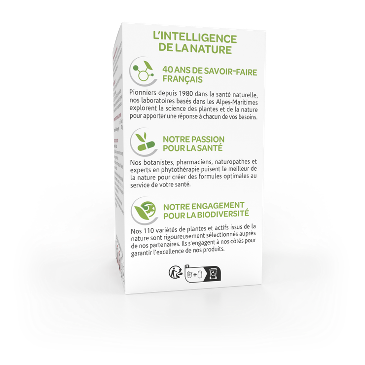 Gélule 100% végétale (dérivé de cellulose). *Obtenue par cryobroyage de feuille de vigne rouge titrée au minimum à 4% en polyphénols totaux.