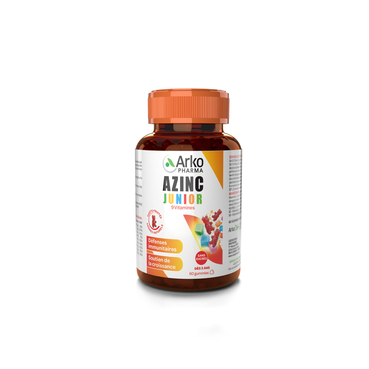 Les gummies Azinc Junior 9 vitamines Arkopharma constituent un complément alimentaire au goût orange, myrtille et framboise recommandé chez l'enfant dès l'âge de 3 ans pour faire le plein d'énergie pour toute la journée. Ils contiennent de la vitamine D qui favorise le bon fonctionnement du système immunitaire, de la vitamine D3 qui participe au bon développement osseux et à la croissance de l'enfant, associées à des vitamines A, C, E, B3, B6, B8, B9 et B12, permettant de lutter contre la fatigue et favorisant un fonctionnement normal du système nerveux.