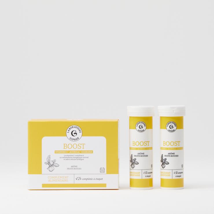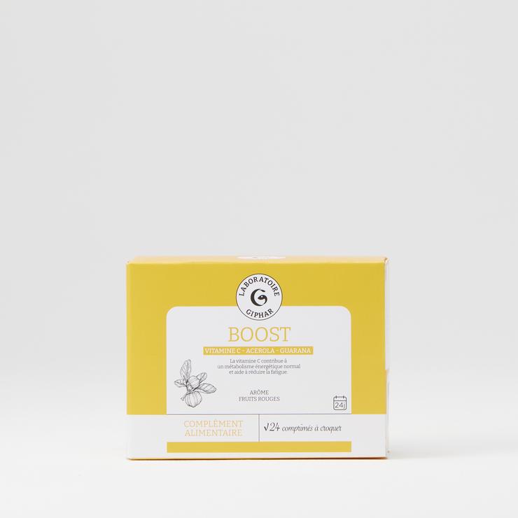 Le complément alimentaire Boost de Laboratoire Giphar, sous forme de comprimés à croquer est composé de vitamine C, de poudre de jus concentré d'acérola et d'extrait de guarana. La vitamine C contribue à un métabolisme énergétique normal et à réduire la fatigue. L'extrait de guarana aide à maintenir la vitalité physique et mentale.
