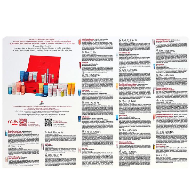 Le calendrier de l’Avent Clarins est constitué de 24 cases contenant chacune un produit de beauté pour prendre soin de votre peau tout au long du mois de décembre en découvrant chaque jour une surprise. Ces produits vont des crèmes visage, baume, lait, huile pour le corps, soins éclat, soins pour le regard, soins pour les mains et toute une gamme de produits de maquillage.