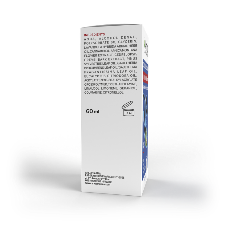 Aqua, alcohol, denat, polysorbate 60, glycerin, lavandula hybrida abrial herb oil, cannabidiol, arnica montana flower extract, cedropolis grevei bark extract, pinus sylvestris leaf oil, gaultheria fragantissima leaf oil, acrylates / c10-30 alkyl acrylate crosspolymer, triethanolamine, lina-loo, limonene, geraniol, courmarine, citronellol.