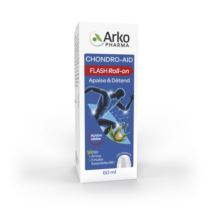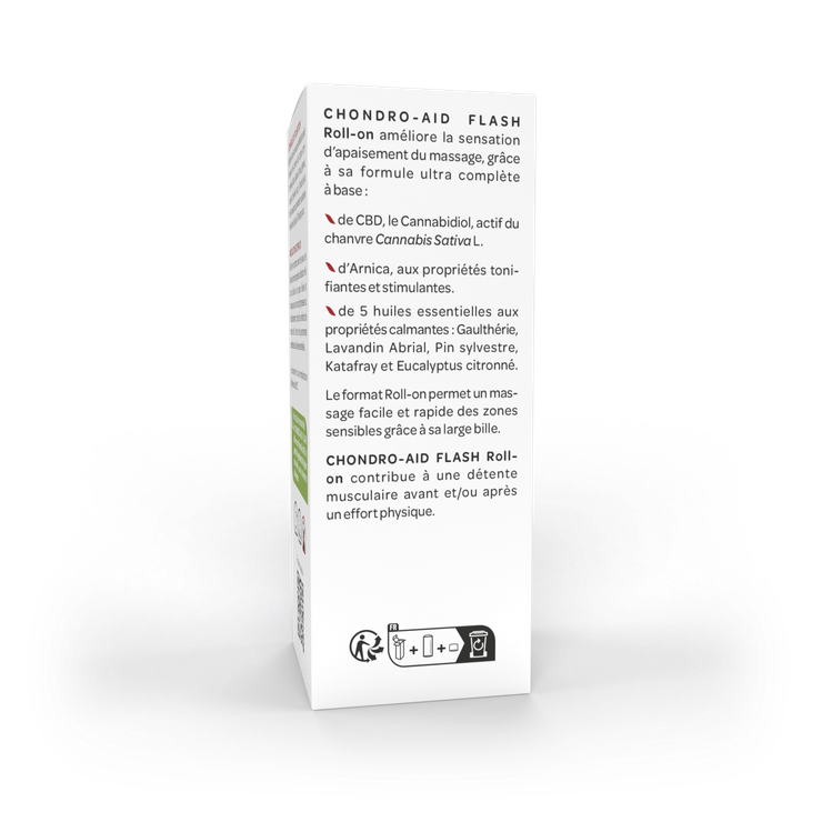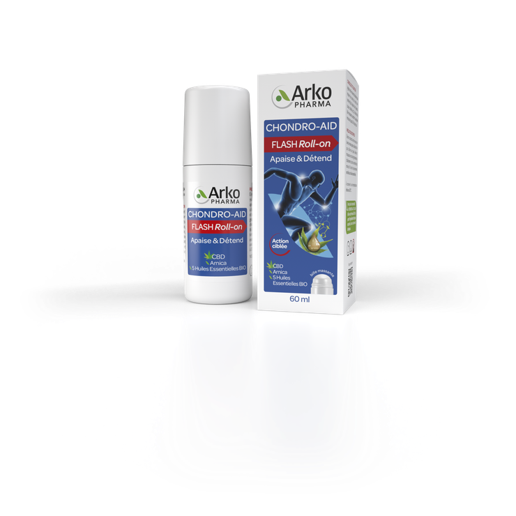 Le roll-on Chondro-Aid Flash Arkopharma est un soin recommandé en cas de douleurs musculaires ou articulaires au cours d'un effort sportif ou après l'effort. Il est formulé à base de CBD qui réduit la sensation de douleur, d'arnica aux vertus tonifiantes et stimulantes et à base d'huiles essentielles de gaulthérie, d'eucalyptus citronné, de katafray, de pin sylvestre et de lavandin abrial qui ont des propriétés calmantes. Le format roll-on est pratique pour une application précise au niveau de la douleur.