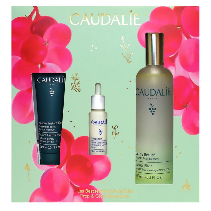 Le Coffret Caudalie Routine Éclat en édition limitée propose une routine en trois étapes avec deux formats voyage offerts : un Masque Instant Détox 15 mL pour resserrer les pores et absorber le sébum, un Sérum Éclat Anti-taches 10 mL pour corriger et prévenir les taches, et l’Eau de Beauté 100 mL une brume 100 % naturelle qui révèle l’éclat du teint, resserre les pores et fixe le maquillage.