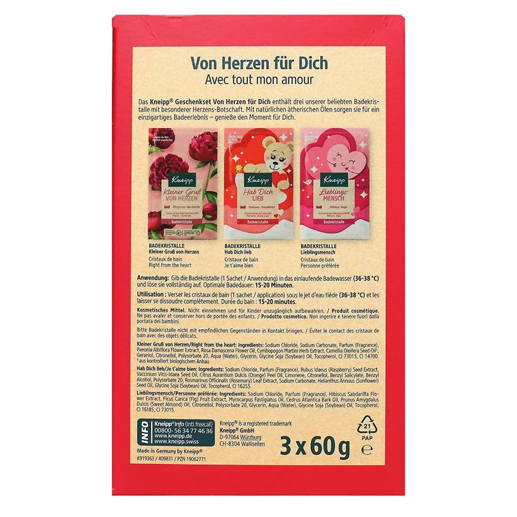 Le coffret-cadeau Kneipp From the heart for you contient trois des cristaux de bain populaires avec un message cœur spécial. Les huiles essentielles naturelles offrent une expérience de bain unique.