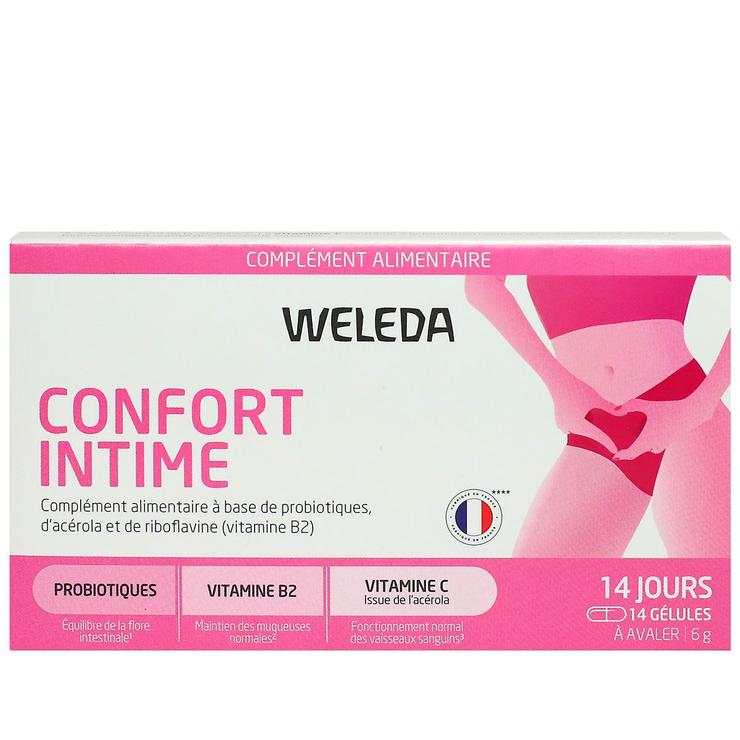Les gélules Confort Intime Weleda constituent un complément alimentaire recommandé chez l'adulte et l'adolescente pour une bonne santé intime dès les premiers cycles menstruels. Elles sont formulées à base de probiotiques qui participent à l'équilibre de la flore intestinale, de riboflavine (vitamine B2) qui favorise le maintien de muqueuses normales et à base d'acérola, source de vitamine C, qui assure un fonctionnement normal des vaisseaux sanguins en boostant la formation de collagène et renforce le système immunitaire de l'organisme.