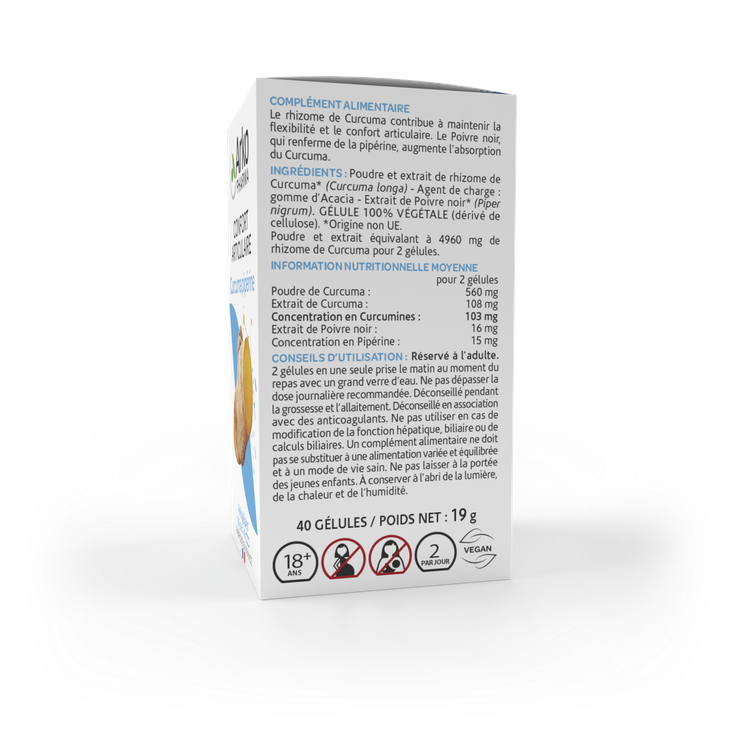 Ingrédients : Poudre intégrale et extrait de rhizome de Curcuma* BIO (Curcuma longa L.), Agent de charge : gomme d'Acacia BIO, Extrait de Poivre noir BIO (Piper nigrum L.). Enveloppe d'origine végétale : Hydroxypropylméthylcellulose.