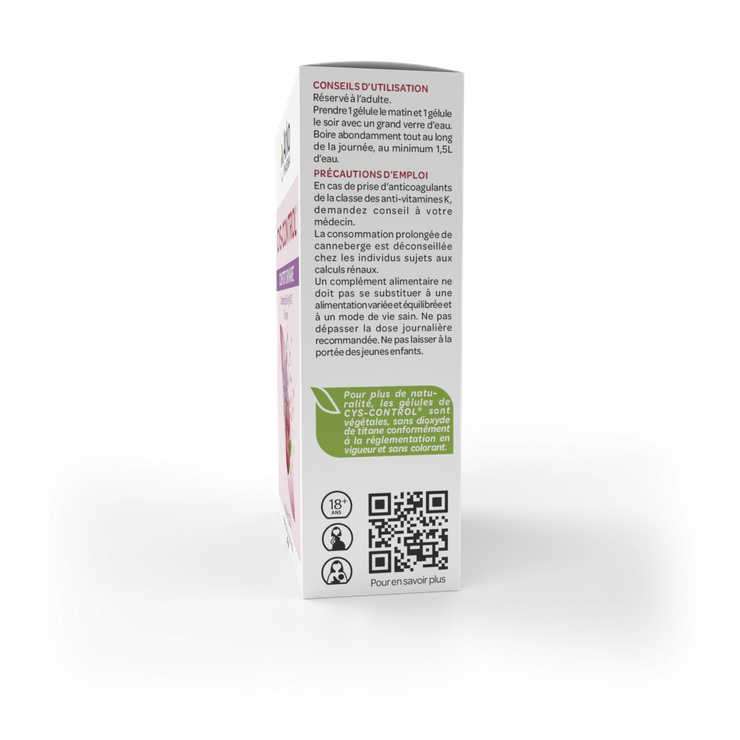 Voie orale. En prévention et en cas d'infection, il est conseillé de prendre 1 gélule le matin et 1 gélule le soir avec un grand verre d'eau. Pour une prévention au long cours, Cys-control gélules peut être utilisé en continu et si la fréquence des infections urinaires diminue, la prise peut être réduite à 1 gélule par jour. Dans tous les cas, buvez abondamment tout au long de la journée, au minimum un litre et demi d'eau. Les infections urinaires chez l'enfant de moins de 12 ans doivent être prises en charge au préalable par un médecin. En cas d'infection urinaire, Cys-control gélules ne remplace pas un traitement antibiotique. Si les symptômes persistent au-delà de 48 heures, un médecin doit être consulté. La consommation prolongée de canneberge chez les individus sujets aux calculs rénaux est déconseillée. En cas de traitement avec des anticoagulants de la classe des anti-vitamines K, il convient d'éviter la prise de Cys-control gélules ou de consulter un médecin. Cys-control gélules est déconseillé en cas d'hypersensibilité à l'un des constituants. N'hésitez pas à demander conseil à votre médecin ou votre pharmacien en cas de survenue d'effets indésirables. Cys-control gélules peut être utilisé par les personnes diabétiques, les femmes enceintes et celles qui allaitent. L'utilisation de Cys-control Gélules ne modifie pas les résultats des examens cytobactériologiques des urines (ECBU). Lire attentivement les instructions figurant sur la notice avant utilisation. Ce dispositif médical est un produit de santé réglementé qui porte, au titre de cette réglementation, le marquage CE.