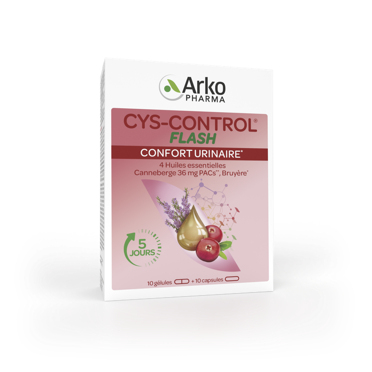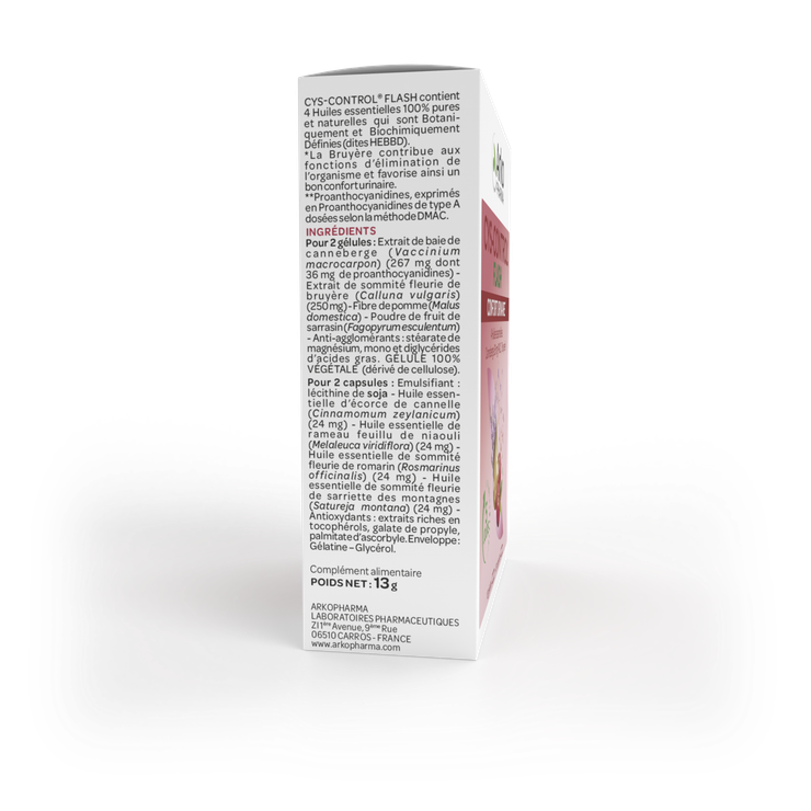 Les gélules et capsules Cys-Control flash Arkopharma constituent un complément alimentaire recommandé pour un bon confort urinaire. Elles sont formulées à base de bruyère, de canneberge et de 4 huiles essentielles 100% pures et naturelles (niaouli, cannelle de Ceylan, romarin et sarriette des montagnes).