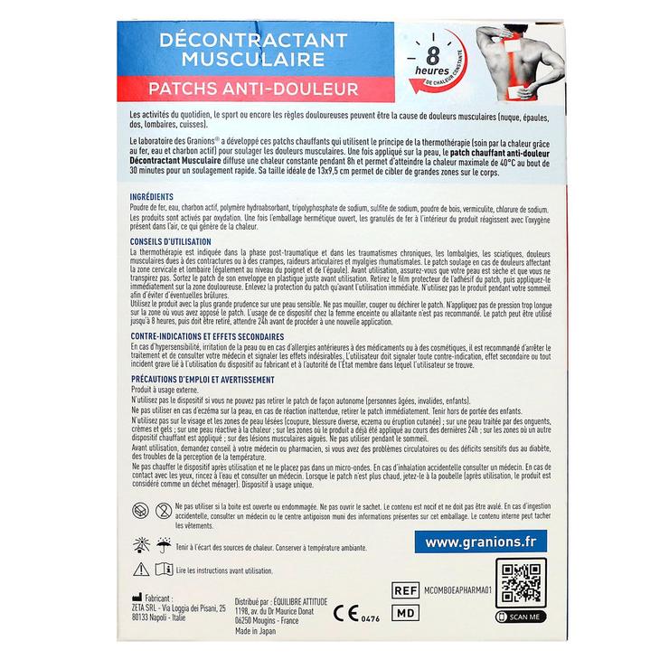 Les patchs Décontractant Musculaire des Laboratoires Granions offrent un soulagement naturel et efficace des douleurs musculaires grâce à la thermothérapie en diffusant une chaleur constante jusqu’à 40 °C en 30 minutes et en restant actifs pendant 8 heures. Conçus pour la nuque, les épaules, le dos, les lombaires et les cuisses, ils apaisent tensions, contractures et douleurs liées à l’effort, aux raideurs, aux lombalgies ou aux règles douloureuses sans recourir aux médicaments. Pratiques et faciles à utiliser, ces patchs de 13 x 9,5 cm à usage unique permettent un confort rapide et ciblé, chaque boîte contenant cinq patchs pour une utilisation simple et efficace au quotidien.
