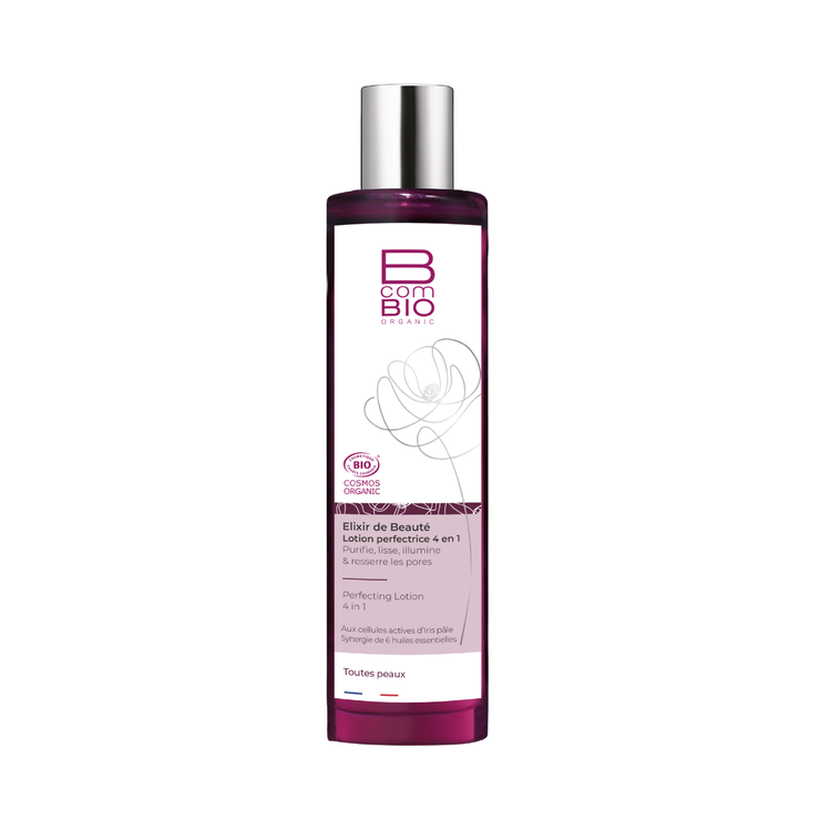 La lotion perfectrice bio Elixir de beauté B com Bio est un soin visage 4 en 1 recommandé pour tous types de peaux. Elle est formulée à base de cellules actives d'iris pâle qui améliorent la qualité de la peau, ont une action lissante et resserrent les pores, d'une synergie de 6 huiles essentielles qui vont avoir une action purifiante et favoriser la régénération cutanée, d'hydrolat de lavande qui rafraîchit et tonifie la peau et à base d'extrait de pomelo riche en AHA qui active le renouvellement cellulaire redonnant de la fraîcheur et de la luminosité au teint.
