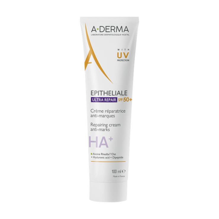La crème réparatrice Epitheliale AH Ultra Repair A-Derma est un soin visage et corps spécialement conçu pour les peaux abîmées et fragilisées de toute la famille. Elle peut être utilisée après un acte dermatologique, en cas d'atteintes superficielles de l'épiderme pouvant laisser des marques cicatricielles et pigmentaires ou encore en soin post-tatouage. Elle est formulée à base de Cicahyalumide, actif associant l'avoine rhealba, l'acide hyaluronique et un dipeptide qui hydratent et favorisent la réparation cutanée et à base d'extrait de liane du Pérou qui soulage les irritations et tiraillements grâce à ses propriétés apaisantes. Cette crème apaise et accélère la réparation cutanée tout en estompant les marques et cicatrices.