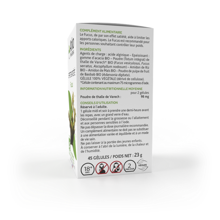 Agent de charge : Acide alginique, Épaississant : Gomme d'acacia Bio, Poudre (Totum intégral) de thalle de varech* Bio (Fucus vesiculosus, Fucus serratus, Ascophyllum nodosum), Amidon de riz Bio, Amidon de maïs Bio, Poudre de pulpe de fruit de baobab Bio (Adansonia digitata). Gélule 100% végétale (dérivé de cellulose). *Gélule contenant au maximum 75 µg d'iode.