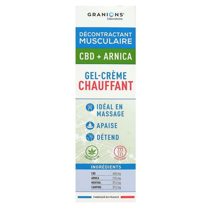 Le Gel-Crème Chauffant CBD et Arnica des Laboratoires Granions est un décontractant musculaire qui apaise et détend les muscles en cas de raideurs, courbatures ou jambes lourdes grâce à une formule combinant CBD, arnica, camphre et menthol. Sa texture gel-crème non grasse et non collante produit un effet chauffant immédiat pour un confort et une détente musculaire rapides, idéale avant ou après l’effort physique. Facile à appliquer, rapidement absorbée et sans tacher les vêtements, cette formule apporte un soulagement efficace des tensions musculaires tout en procurant une sensation agréable de relaxation et de bien-être.