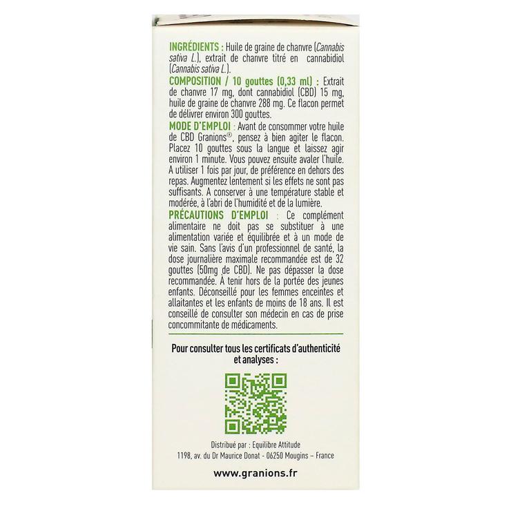 L'huile CBD 5% Granions est une huile de chanvre enrichie en cannabidiol (CBD) qui permet de profiter de toutes les vertus des graines de chanvre. Elle possède des propriétés antioxydantes grâce aux omégas 3 et 6 et à la vitamine E qui entrent dans sa composition, participe à la régulation de l'équilibre biologique de l'organisme et produit ainsi des effets bénéfiques sur l'ensemble du corps. Cette huile ne contient pas de THC, substance cannabinoïde aux effets psychoactifs.