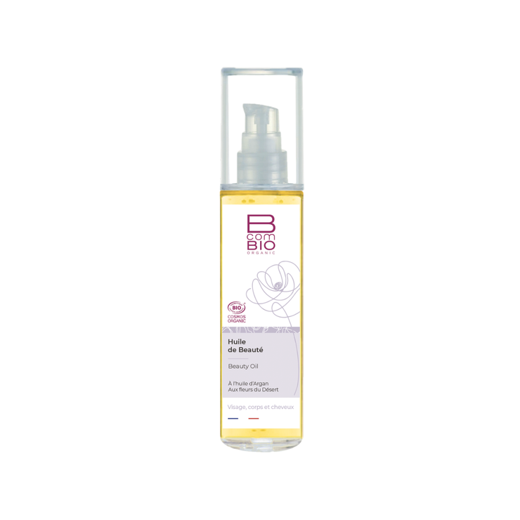 L'huile de Beauté B com Bio est recommandée pour nourrir et sublimer la peau du visage, du corps et les cheveux. Cette huile sèche multifonctions est composée d'huile d'argan et de fleurs du désert. L'huile d'argan provenant du Maroc, 100% pure et biologique, très concentrée en vitamine E, est obtenue par première pression à froid. Les fleurs du désert sont enrichies en vitamine A et permettent de protéger la peau de la déshydratation. Cette huile de Beauté a une texture soyeuse et n'est pas grasse. Elle laisse la peau douce, satinée, et enveloppée d'une fragrance délicate et ensoleillée, et les cheveux nourris en profondeur.