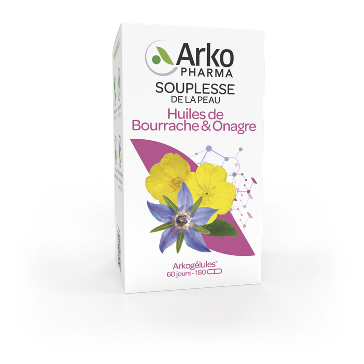 Les Arkogélules huile d'onagre et bourrache Arkopharma constituent un complément alimentaire formulé à base d'huiles d'onagre et de bourrache concentrées en acide γ-linolénique et en acide linolénique recommandé pour préserver la beauté de la peau et lui permettre de retrouver souplesse et tonus notamment en cas de variations hormonales chez la femme en période prémenstruelle.
