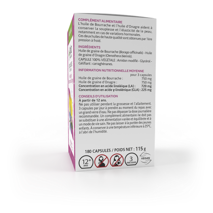 Huile de graine d’Onagre BIO (Oenothera biennis) 750 mg; Huile de graine de bourrache (Borago officinalis L.) 750 mg; Capsule 100% végétale : Glycérol – Amidon de Maïs BIO – Gélifiant : carraghénanes extraits d’algues rouges.