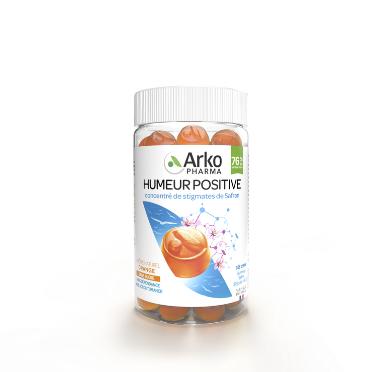 Les gummies Humeur positive Arkopharma constituent un complément alimentaire au goût orange recommandé pour toute la famille à partir de 12 ans pour favoriser l'humeur positive. Ils sont formulés à base d'extraits de stigmates de safran qui contribue à l'équilibre émotionnel en diminuant les tensions, il agit sur la dopamine, hormone du plaisir, la sérotonine hormone de la sérénité impliquée dans la régulation de l'humeur et la noradrénaline qui stimule l'estime de soi.