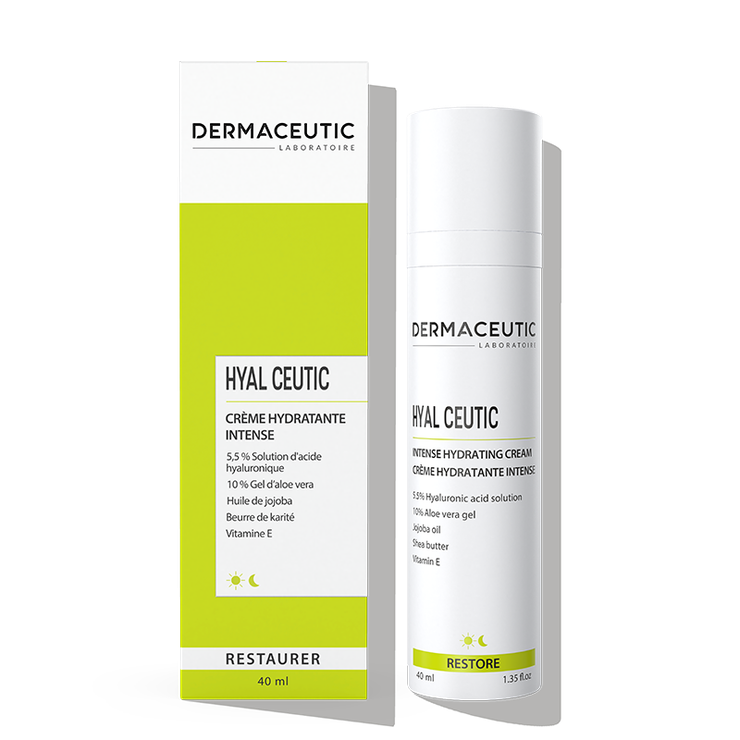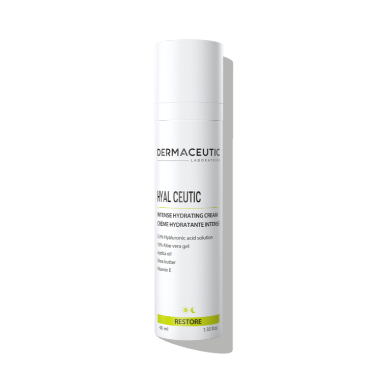 La crème hydratante intense Hyal Ceutic Dermaceutic est un soin formulé à base d'acide hyaluronique, d'aloé vera, de beurre de karité et de jojoba recommandé pour les peaux en manque d’hydratation et présentant des signes de l’âge précoces. Elle contribue à nourrir en profondeur l’épiderme pour le garder hydraté tout au long de la journée. Elle aide également à lisser le grain de peau et à atténuer le vieillissement prématuré de la peau dû à la sécheresse.