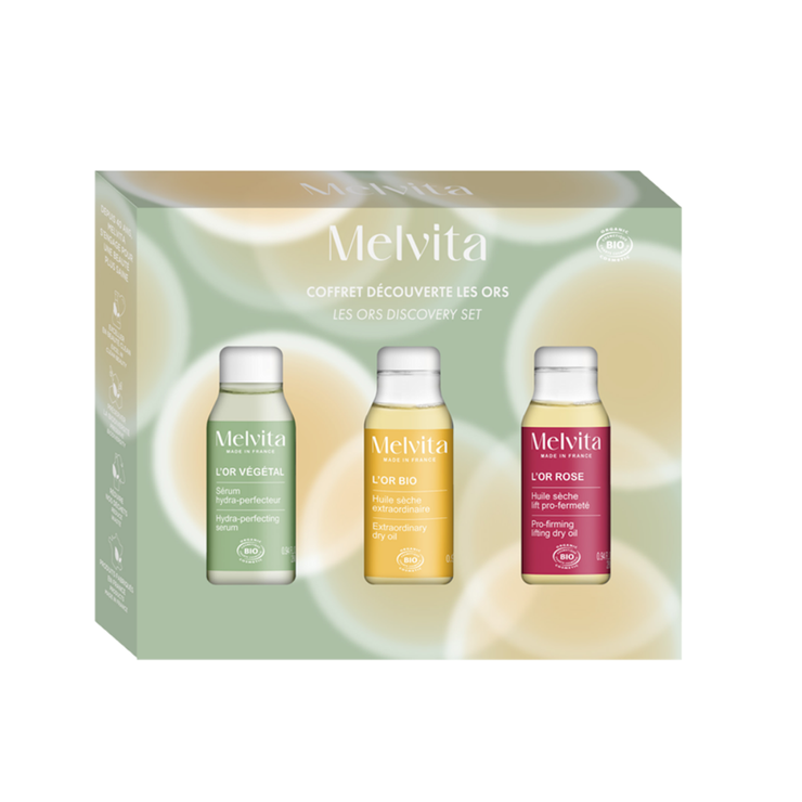 Le Coffret Découverte Les Ors de Melvita renferme 3 soins enrichis en huiles précieuses. Le Sérum Hydra-Perfecteur L’Or Végétal constitue un soin qui hydrate, apaise et affine le grain de la peau. Sa formule biphasée pénètre rapidement pour offrir une hydratation intense tout en lissant les irrégularités, laissant la peau douce, apaisée et plus lisse au fil des applications grâce à sa formule concentrée en extrait de feuille de châtaignier, AHA extrait du pomelo et huile de châtaigne. L'huile sèche extraordinaire L'Or Bio est recommandée pour nourrir en profondeur et sublimer la peau du visage, du corps et les cheveux. Cette huile sèche et satinée est composée de 5 huiles rares et précieuses (huile d'argan du Maroc, huile d'inca inchi d'Amazonie, huile de dattier du désert du Burkina, huile de baobab d'Afrique et huile de kendi d'Indonésie). Elle est non collante et rapidement absorbée par la peau permettant de s'habiller rapidement. Elle permet de fortifier et d'améliorer la qualité de la peau, des ongles et des cheveux et elle leur laisse un délicat parfum frais et envoûtant. L'huile sèche lift pro-fermeté L'Or Rose offre une triple action fermeté, elle affine la silhouette, contribue à réduire l'aspect peau d'orange, lisse et raffermit tous types de peaux. Sa formule contient des actifs raffermissants puissants qui agissent sur la tonicité de la peau comme l’extrait de poivre noir qui favorise la microcirculation du sang, limite le stockage des graisses et contribue à raffermir, lisser et affiner la peau, l’huile de baies roses qui permet de réduire l’effet peau d’orange et l’huile de cranberry concentrée en oméga 6 et antioxydants qui aide à renforcer la peau et à préserver son hydratation. Cette huile sèche à la pénétration rapide active le drainage et aide à éliminer les toxines pour une peau visiblement raffermie et une silhouette sublimée.