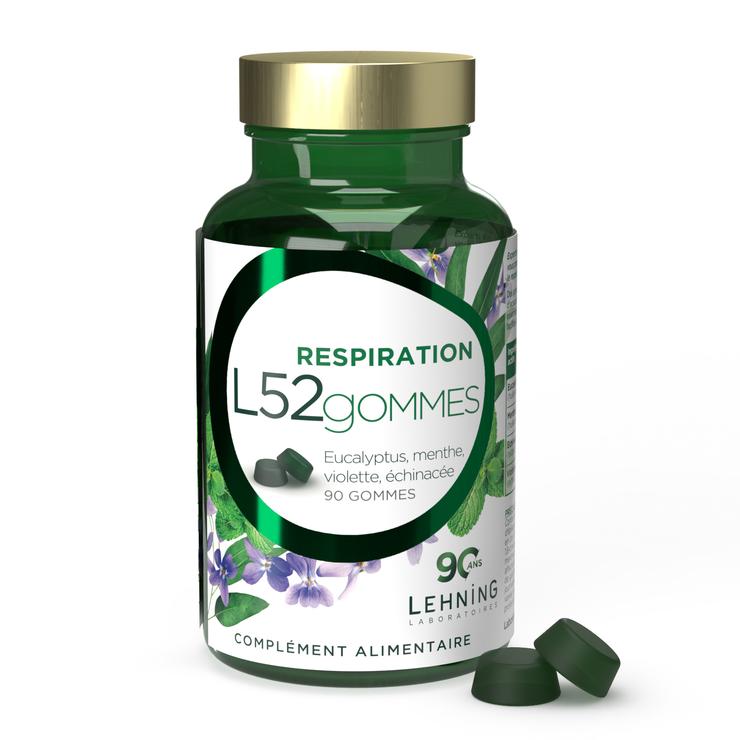 Les gommes L52 Respiration constituent un complément alimentaire recommandé dès 12 ans pour faciliter la respiration et adoucir la gorge en cas d’irritation. Elles sont formulées à base d’huiles essentielles d’eucalyptus, de menthe poivrée, de menthol, d'extrait de violette, d'échinacée qui apaisent la gorge, adoucissent le pharynx et soutiennent le système immunitaire.