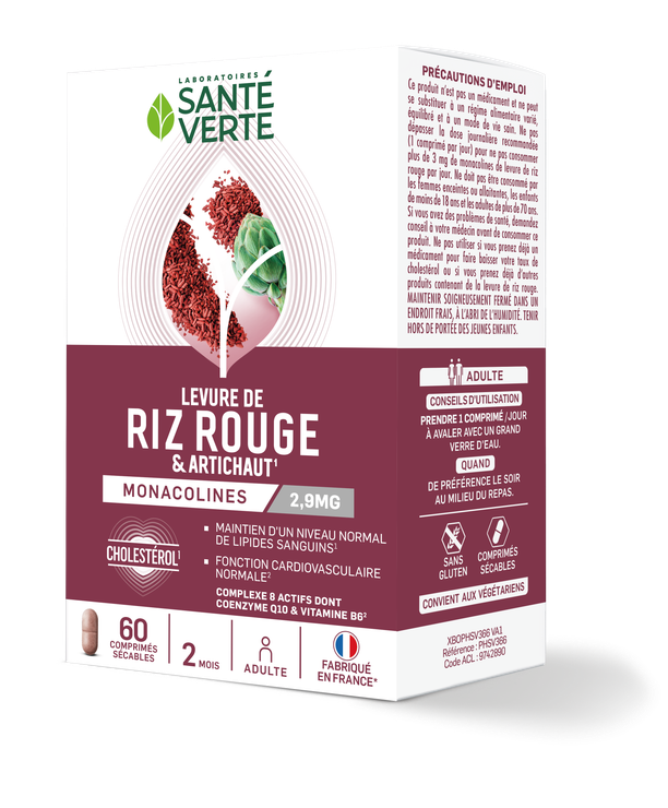 Les comprimés de levure de riz rouge Cholestérol Santé Verte constituent un complément alimentaire formulé à base de levure de riz rouge renfermant du policosanol qui agit en améliorant la circulation artérielle et réduit le mauvais cholestérol, de vitamine E, d'extrait d'artichaut et de coenzyme Q10 recommandé pour le maintien normal du taux de cholestérol dans le sang. La vitamine E agit aussi en protégeant les cellules contre le stress oxydatif et l'artichaut participe au bon fonctionnement cardiaque.