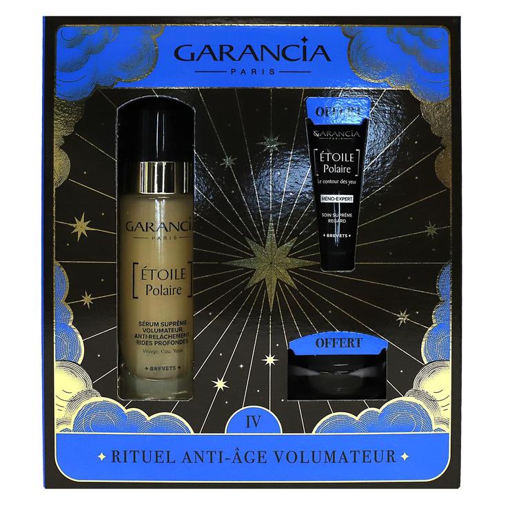 Le coffret Rituel anti-âge volumateur Garancia renferme un Sérum Suprême Fermeté Etoile Polaire, soin volumateur pour peaux matures pour le visage, le contour des yeux et le cou. Il est formulé à base d'une association de peptide breveté Lipovolume TM, d'acide hyaluronique, de cellules souches végétales d'Edelweiss et d'extraits botaniques. Il réduit les rides d'expression, de déshydratation, de surface, les rides profondes et les ridules, a une action revitalisante et redessine l'ovale du visage. Ce coffret contient aussi Une Crème Suprême de nuit À la Belle Etoile offerte, soin recommandé pour les femmes dès l'âge de 50 ans formulé à base de peptide nouvelle génération Lipovolume TM qui améliore le volume et les contours du visage, d'acide hyaluronique aux propriétés hydratantes, repulpantes et lissantes, de cellules souches d'Edelweiss aux vertus raffermissantes, d'algue wakamé et d'algue brune qui luttent contre le neurovieillissement et redessinent le contour du visage, de beurre de karité qui nourrit et d'extrait de lavande qui active la mélatonine pour une peau plus lumineuse. Cette crème agit durant votre sommeil pour une peau plus ferme et rajeunie au réveil. Un Soin supême regard Etoile Polaire Méno-Expert offert également complète ce coffret, soin contour des yeux recommandé pour les femmes dès l'âge de 50 ans, formulé à base du complexe Eyes-Uplift, qui agit sur les rides profondes, les poches, les cernes, lutte contre le relâchement des paupières et redonne éclat et fermeté au contour de l'œil.