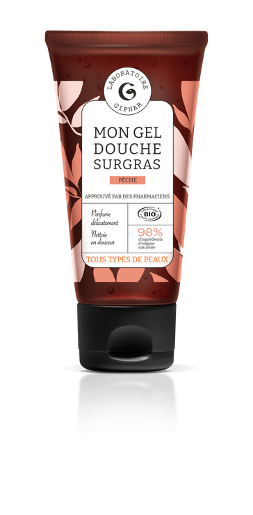 Mon Gel Douche Surgras parfum Pêche certifié BIO du Laboratoire Giphar est le soin d'hygiène indispensable pour tous types de peaux. Il laisse la peau délicatement parfumée. Convient à toute la famille dès 3 ans. 98% des ingrédients sont d'origine naturelle.