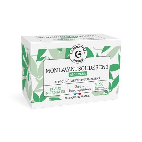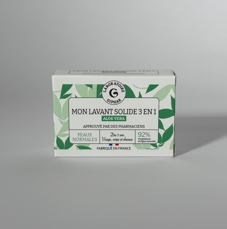 Mon solide 3-en-1 de Laboratoire Giphar, au parfum délicat d'Aloe Vera, est le soin lavant idéal pour votre routine quotidienne. Il s'utilise sur le corps, le visage et les cheveux, vous permettant ainsi un gain de place dans votre salle de bain. Emportez-le partout avec vous (sport, voyage, etc.) !
