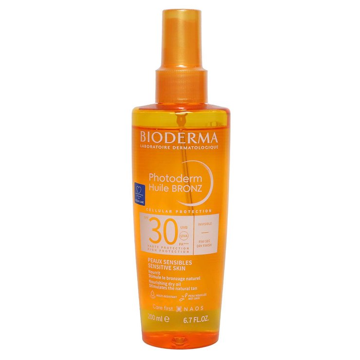 L'huile Bronz Photoderm SPF30 Bioderma est un soin solaire visage corps et cheveux recommandé pour les peaux sensibles mates à foncées. Elle est formulée à base d'une association de filtres UV photostables qui assurent une haute protection contre les UVA responsables du photovieillissement cutané et les UVB responsables des coups de soleil et du brevet Sun Active Defense qui renforce les capacités d'auto-défense de la peau face au soleil. Elle contient aussi de la vitamine E aux propriétés antioxydantes qui protège les cellules du stress oxydatif. Cette huile va nourrir la peau, l'hydrater, stimuler, intensifier et prolonger le bronzage naturel.