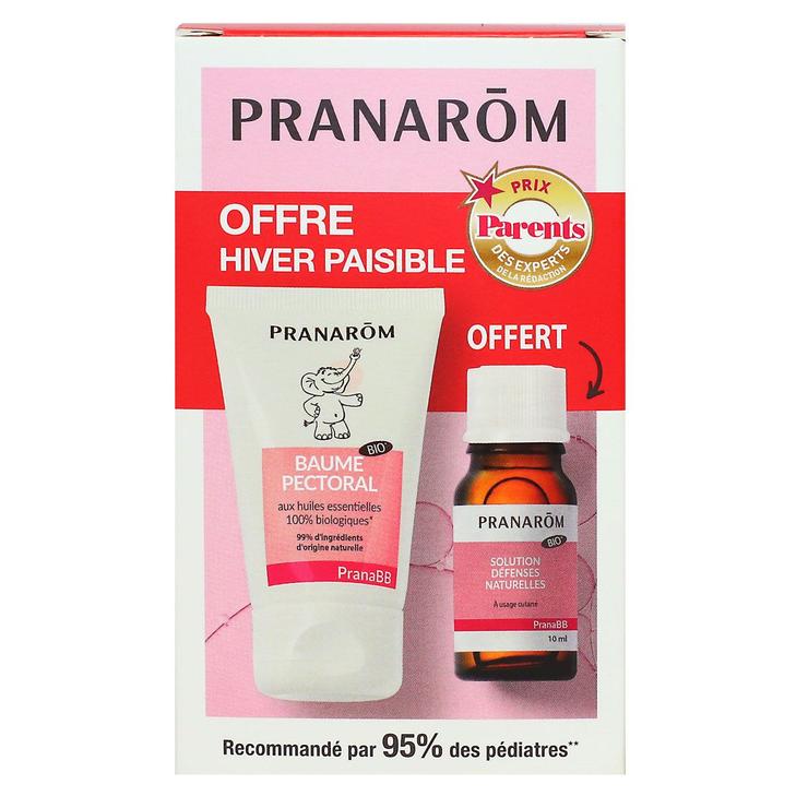 Le duo PranaBB Baume pectoral bébé + Défenses naturelles constitue un coffret de soins aromatiques recommandé pour les nourrissons et jeunes enfants à partir de 10kg. Il est formulé à base d’huiles essentielles 100 % biologiques, d’extraits de plantes, d’huiles végétales douces qui soutiennent les défenses naturelles, facilitent la respiration, apaisent les petits inconforts respiratoires, contribuent à un sommeil plus paisible, respectent la peau sensible des tout-petits.