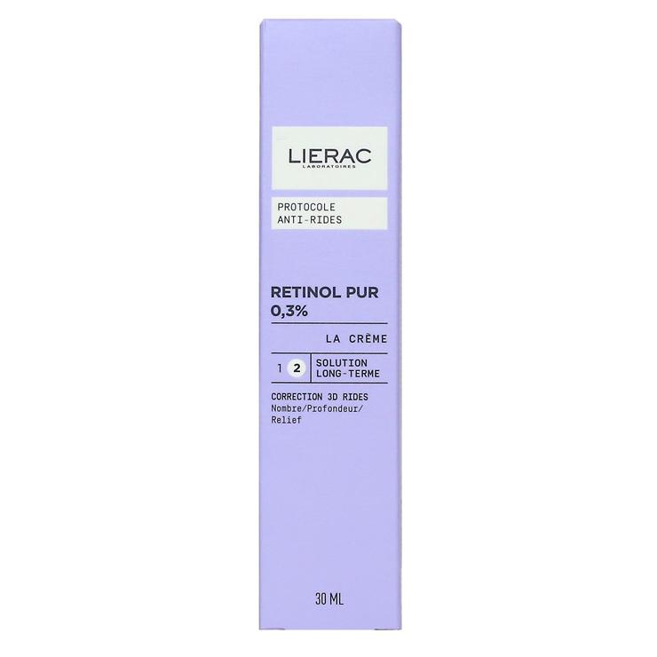 La Crème Protocole Anti-Rides Rétinol Pur 0,3 % de Lierac est un soin anti-âge global conçu pour corriger tous types de rides, qu’il s’agisse de ridules, de rides d’expression, récentes ou installées, tout en prévenant l’apparition de nouvelles marques de vieillissement. Sa formule composée à 88 % d’ingrédients d’origine naturelle associe du rétinol, reconnu pour stimuler la synthèse du collagène et favoriser la régénération cellulaire, du bisabolol aux propriétés apaisantes et du squalane protecteur, pour améliorer l’élasticité et la fermeté de la peau. Sa texture crème fondante, confortable et non grasse pénètre facilement pour offrir un effet repulpant et lissant, laissant la peau visiblement plus douce, souple et revitalisée avec une efficacité anti-âge cliniquement prouvée.
