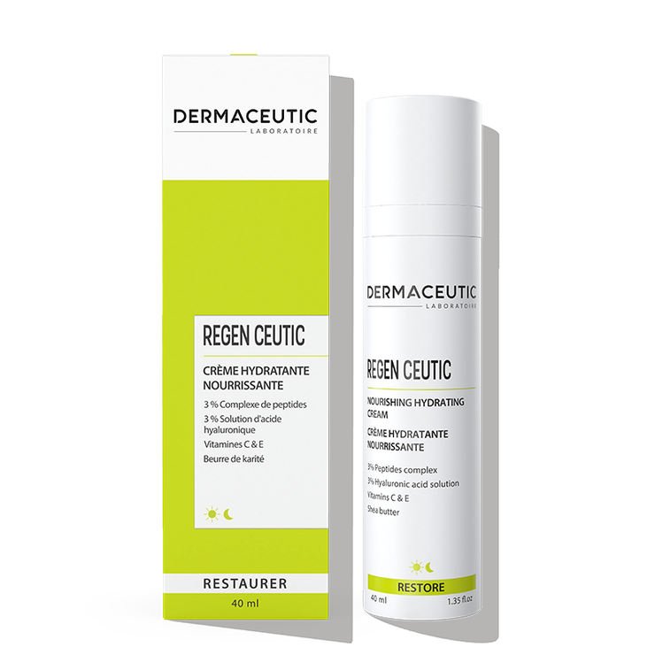 La crème hydratante nourrissante Regen Ceutic 40 ml constitue un soin réparateur anti-âge recommandé pour les adultes ayant la peau fragilisée par le temps, le vieillissement hormonal ou les agressions extérieures, elle est formulée à base d’actifs régénérants, d’actifs hydratants, d’actifs nourrissants qui augmentent la régénération de la peau, améliorent son élasticité, assurent une hydratation optimale, repulpent la surface cutanée, restaurent intensément la peau, apportent une sensation de confort et réduisent visiblement l’apparence des rides.