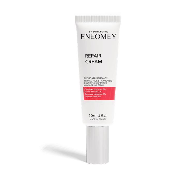 Repair Cream Eneomey est une crème réparatrice apaisante spécialement conçue pour les peaux sensibilisées et irritées. Formulée à base de beurre de karité et de paynia, d'extraits de camomille et d'aloé vera, de niacinamide et de phytosqualane, cette crème est particulièrement recommandée après un acte esthétique tel qu'une séance laser ou un peeling car elle favorise la régénération naturelle de l'épiderme, elle réduit les rougeurs et renforce la barrière hydrolipidique cutanée.