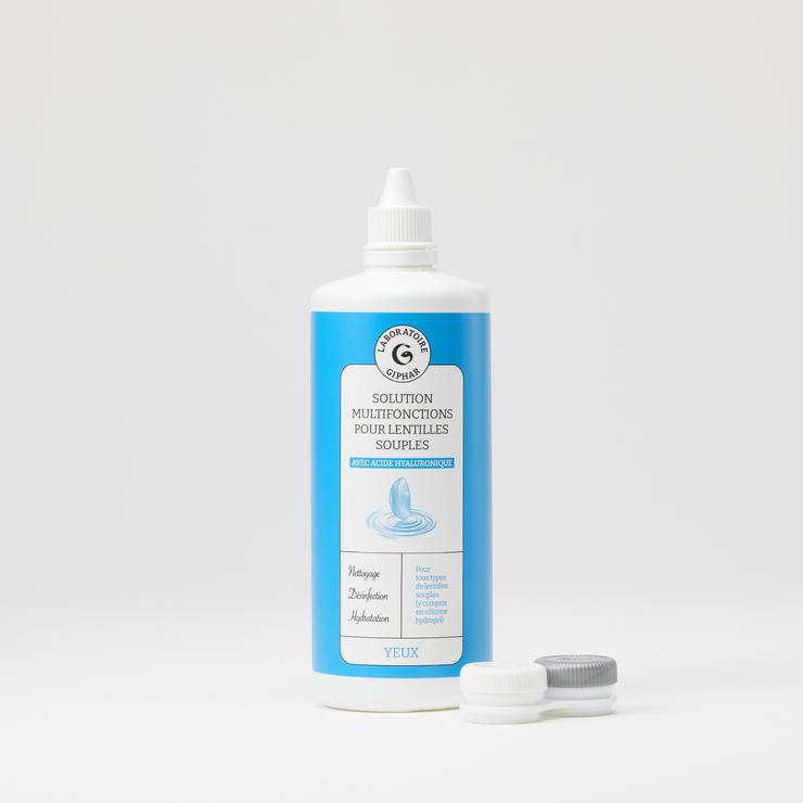 La solution de Laboratoire Giphar contient de l'acide hyaluronique. Elle est indiquée pour la désinfection, laconservation, le nettoyage, l'hydratation ainsi que le rinçage, pour prévenir et/ou éviter la formation de dépôts de protéines et comme humectant pour tous les types de lentilles de contact souples. L'hyaluronate de sodium, un polysaccharide naturel, maintient la surface des lentilles hautement mouillable et offre un bon confort aux porteurs de lentilles de contact.