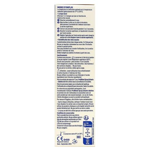 2 pulvérisations dans chaque narine 2 à 3 fois par jour. 1 à 3 par jour en fonction de l’encombrement des fosses nasales. Moucher préalablement le nez. Bien incliner la tête sur le côté et introduire délicatement l’extrémité de l’embout dans la narine supérieure. Exercer une pression franche pendant 2 ou 3 secondes. Boucher la narine supérieure, le liquide doit s’écouler par l’autre narine. Renouveler l’opération sur l’autre narine après avoir changé la position de la tête. Moucher le nez si besoin.